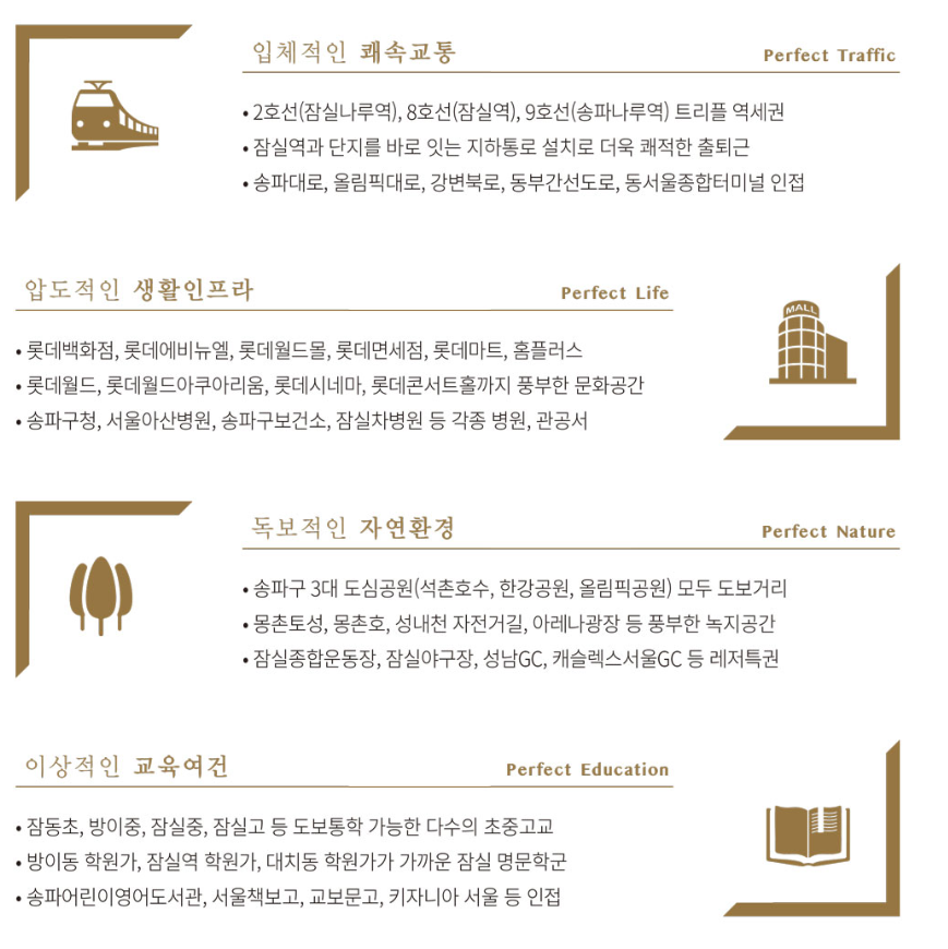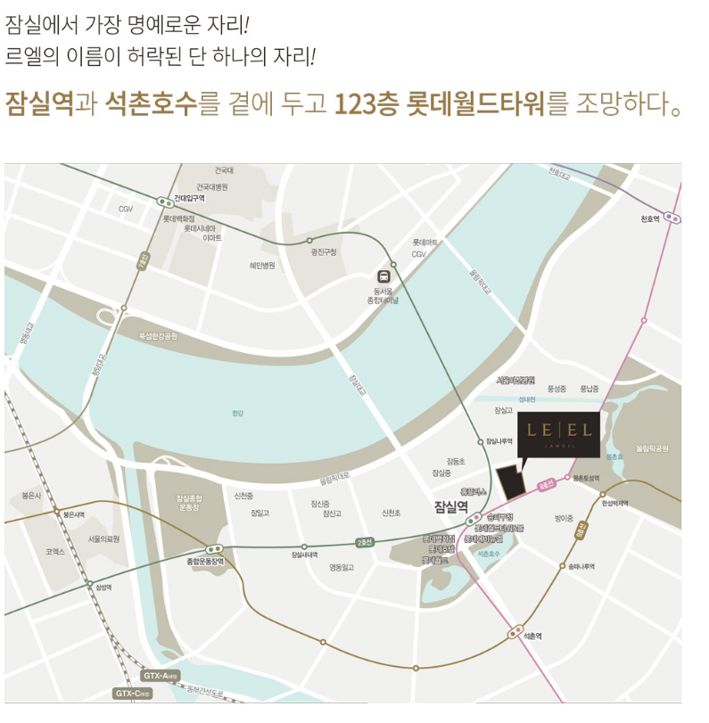 - 롯데월드몰, 롯데타워, 석촌호수, 한강 모두 생활권
